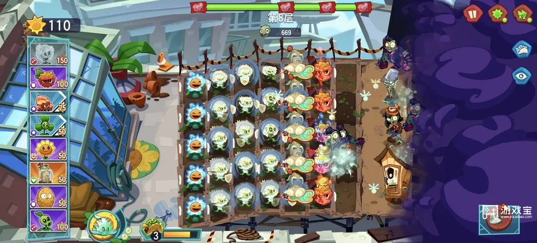 难度一核心战术:优先选择风技能。开局种植顺序:火向日葵 → 火荔枝 → 人参 → 蒲公英。关键点:蒲公英种植需紧盯最早出现气球僵尸的路径。